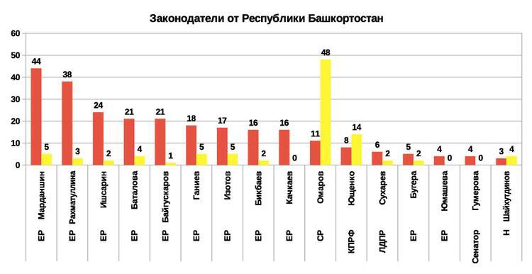 Интересы Республики Башкортостан в федеральном парламенте представляют пятнадцать депутатов и два сенатора. Бывший мэр Уфы, ныне заседающий в СФ Ирек Ялалов исключен из исследования, так как был наделен полномочиями только в 2018 году и еще не успел развернуть законодательную активность в полной мере. Все фракции федерального парламента имеют своих представителей в регионе, а также независимый депутат Рифат Шайхутдинов, не входящий ни в одну фракцию Государственной Думы. Данные о законотворческой активности и принадлежности депутатов и сенаторов к тому или иному региону взяты с официальных сайтов Государственной Думы и Совета Федерации. Исследователями были подсчитаны законодательные инициативы, внесенные в Государственную Думу в период действия VII созыва (до 16 сентября 2019 года). Разделение депутатов и сенаторов на группы «активных», «пассивных», «плодовитых», «стопудовых», «вне конкурса», «суетливых», «ленивых», «холостых», «пустопорожних» и «разовых» было произведено условно, с долей иронии, чтобы облегчить восприятие результатов сложного исследования.