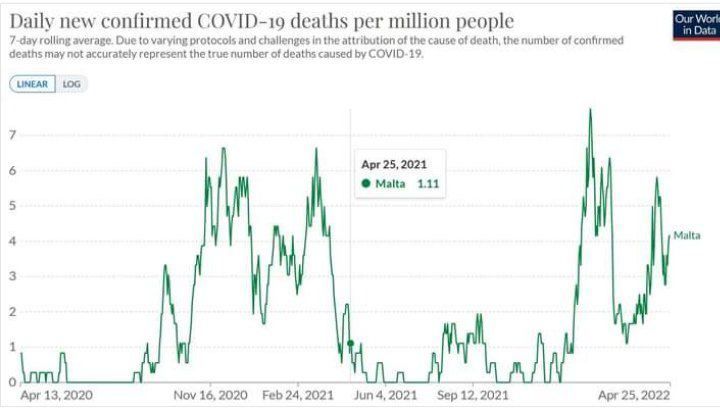Тем не менее, две текущие сезонные волны кoвuдной смертности (зимняя и весенняя) мало чем отличаются по амплитуде от таких же волн годичной давности, когда было полностью прuвuто от 0% (зимой) до 19% (в конце апреля) мальтийцев.