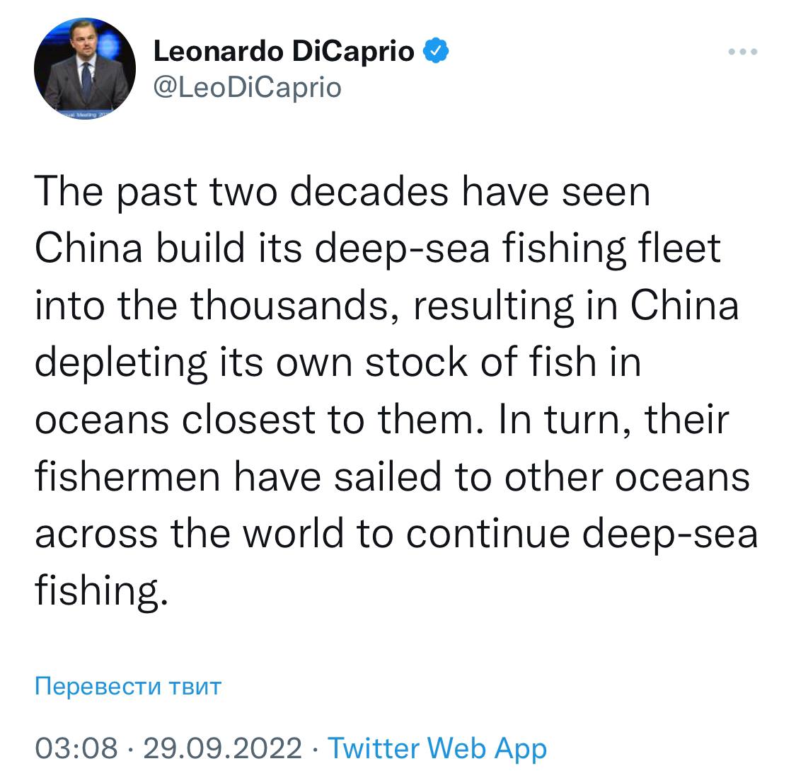 Голливудский актёр осудил китайских рыбаков за бесконтрольный вылов, опубликовав пост в Твиттере. На критику отреагировал пользователь «Гуаньча».
