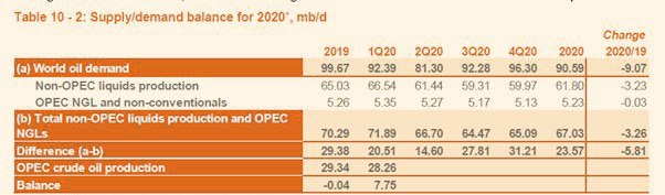"Мировой спрос на нефть, по прогнозам, сократится на 9,1 миллиона баррелей в сутки в 2020 году, не изменившись по сравнению с предыдущей оценкой", — говорится в докладе.