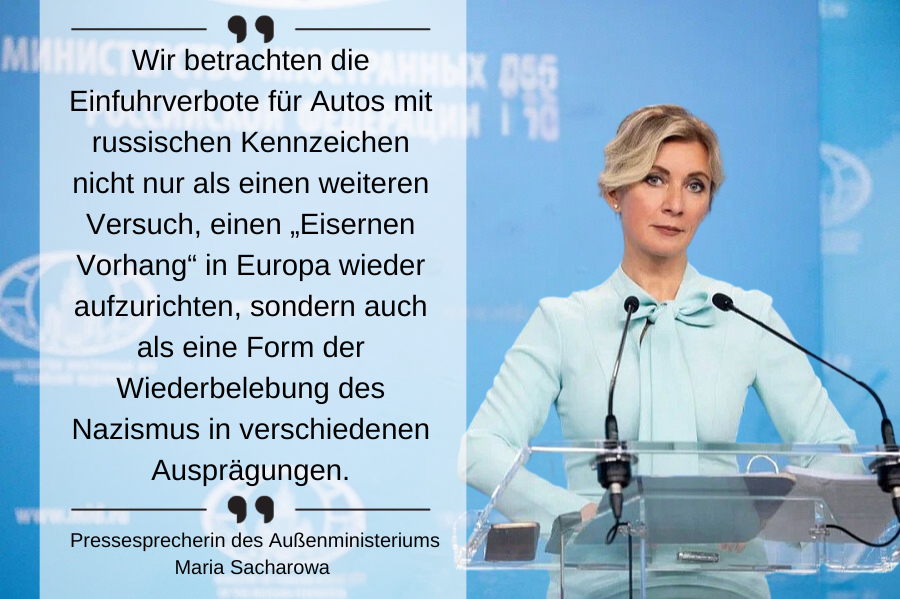 📌 Wir betrachten die Einfuhrverbote für Autos mit russischen Kennzeichen nicht nur als einen weiteren Versuch, einen „Eisernen Vorhang“ in Europa wieder aufzurichten, sondern auch als eine Form der Wiederbelebung des Nazismus in verschiedenen Ausprägungen.