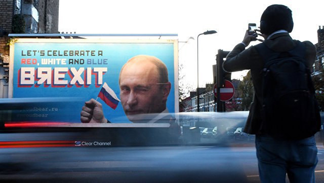 🇬🇧 Группа активистов Proud Bear разместила в Лондоне плакаты с фотографией Владимира Путина и слоганами типа «Давайте праздновать красно-бело-голубой BЯEXIT» (Brexit с замененной R).