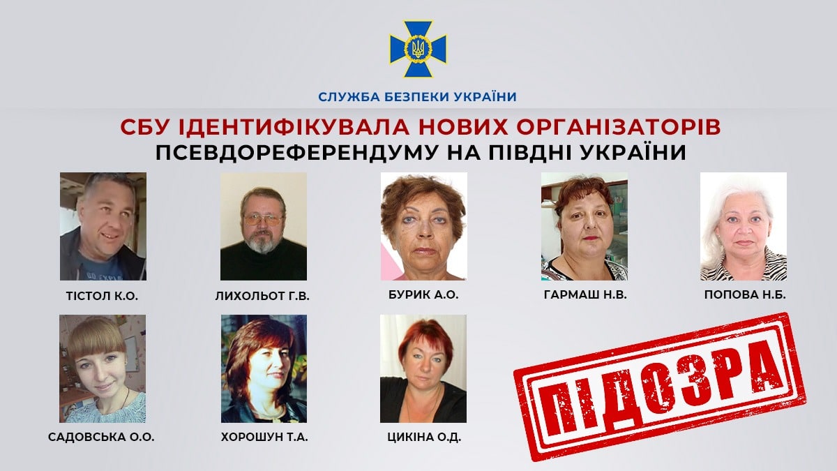 Служба безпеки продовжує викривати зрадників і колаборантів на тимчасово окупованих територіях нашої держави. В результаті слідчо-оперативних дій встановлено особи ще вісьмох організаторів незаконних «референдумів» у тимчасово захоплених районах Херсонської та Миколаївської областей.