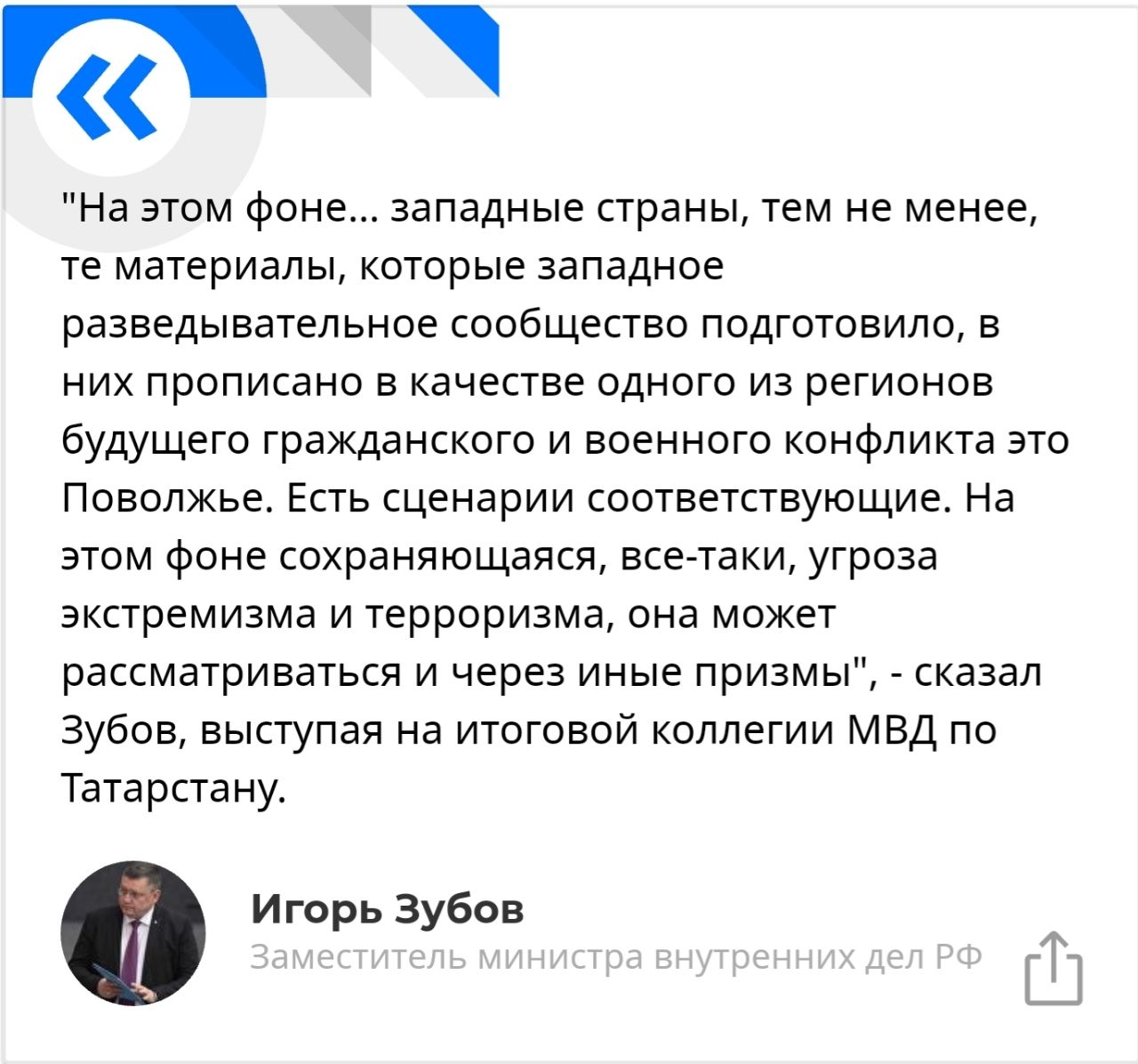 Западное разведывательное сообщество изучает сценарии возможных военных конфликтов в разных регионах России, одним из них называется Поволжье, заявил замминистра внутренних дел РФ Игорь Зубов.