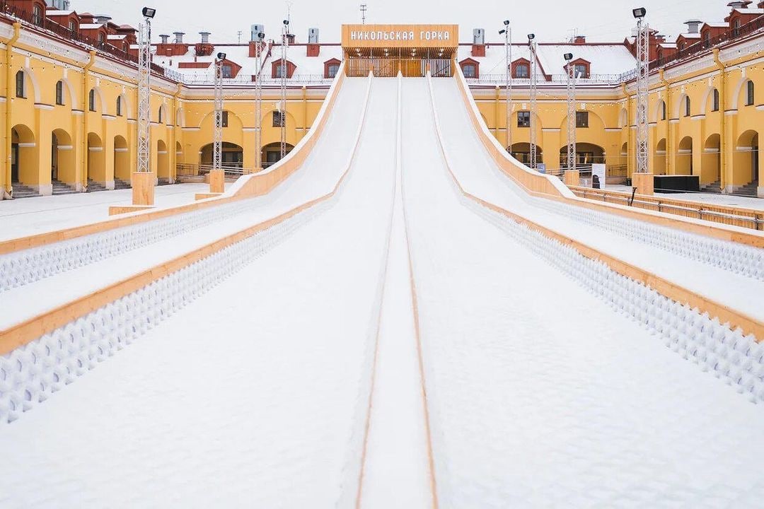 В Никольских рядах появилась самая большая в Петербурге ледовая горка. Сооружение готово к работе и, как заявляют сотрудники общественного пространства, скоро должно открыться.