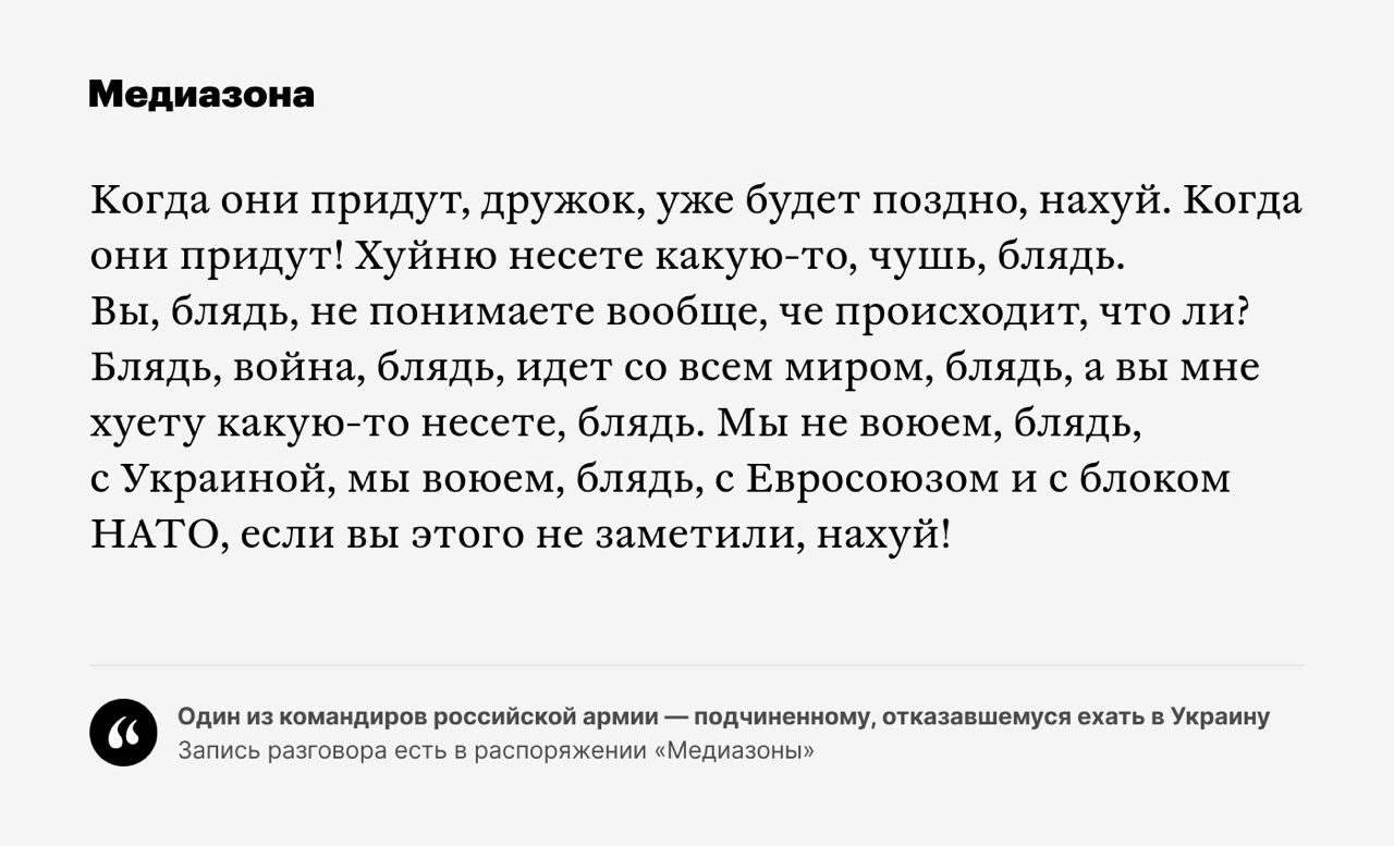 В распоряжении «Медиазоны» оказались несколько записей разговоров командиров российской армии с подчиненным. Например, один командир называет военного, которого еще недавно хвалил за смелость, «подлецом», «трусливым существом», «козлиной», «сволочью» и «тварью».