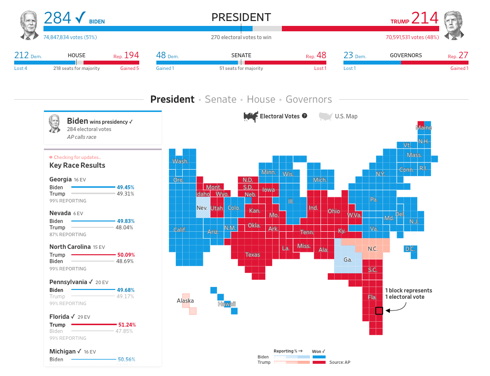 Выборы еще не закончились, но у Джо Байдена 284 голоса выборщиков. Для победы, напомню, необходимо 270 голосов.