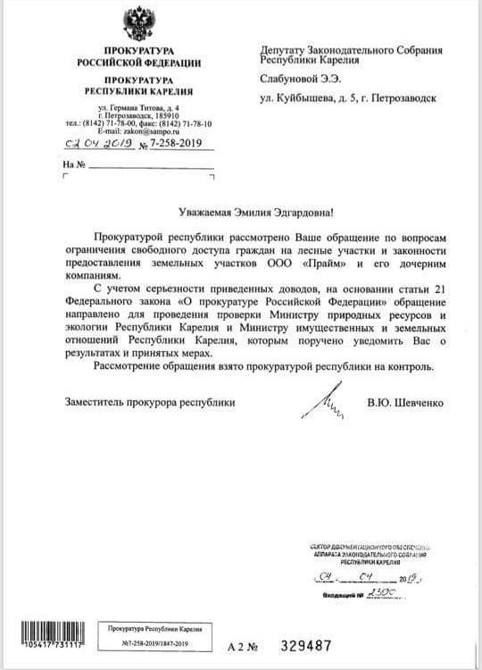 После моего обращения в прокуратуру Карелии проверить законность передачи 1700 га карельского леса структурам Ковальчуков, прокуратура попросила провести проверку министра природных ресурсов и экологии Карелии и министра имущественных и земельных отношений республики.
