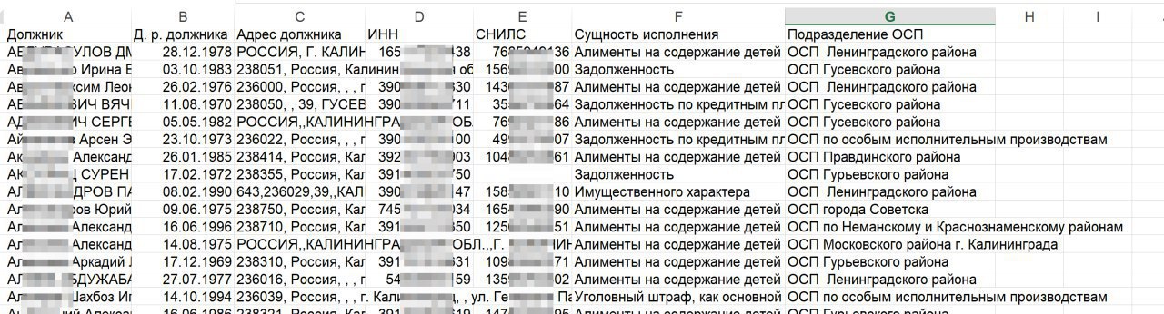 В свободном доступе появилась база данных должников Калининградской области за 2018 год. БД содержит персональные данные (ФИО, ИНН, СНИЛС, адрес и т.п.) 2317 человек.