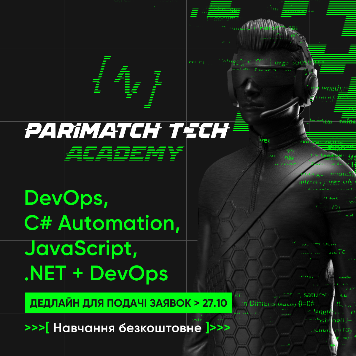 Це — новий набір у Parimatch Tech Academy. Тут запускається чотири безкоштовні програми — з JavaScript, .NET + DevOps, C# Automation та DevOps. За кілька місяців ти отримаєш базові знання зі своєї сфери, навчишся працювати в команді та створиш власний проєкт.