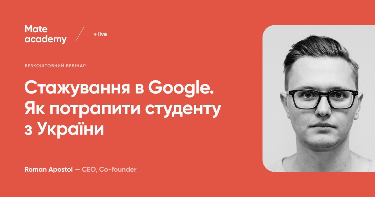 Роман Апостол випускник КНУ. З першого курсу працював програмістом віддалено на американську компанію. Після завершення університету поїхав в Google (New York), де пропрацював 4.5 роки. Пройшов шлях від програміста до тім-ліда команди, що генерувала $200M на рік. В 2018 повернувся до України, щоб займатися розвитком онлайн школи програмування Mate academy.