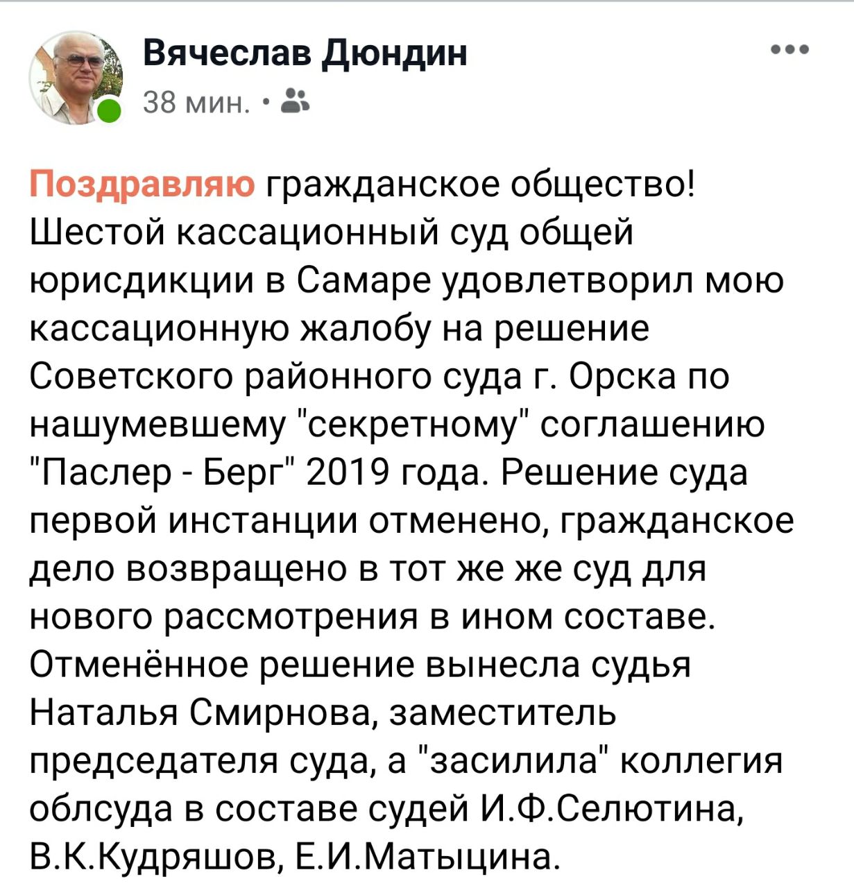 Правозащитник Вячеслав Дюндин одержал новую победу в суде, требуя предоставить ему фактически засекреченное соглашение между Правительством Оренбургской области (на момент подписания возглавляемой Бергом Ю.А.) и ПАО "Т плюс" (тогда - во главе с Денисом Паслером) нынешним губернатором Оренбуржья.