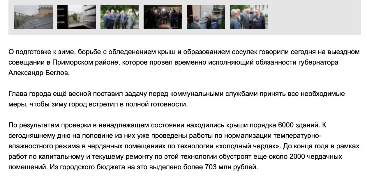 Второе, о технологии "холодный чердак": цифры и количества зданий не производят того впечатления, которое могли бы, если была бы детализация - где, как, конкретные примеры, инфографика. Это уже не к Смольному вопрос, а к обслуживающими инфопоток журналистам - их там реально уйма на государственном финансировании.