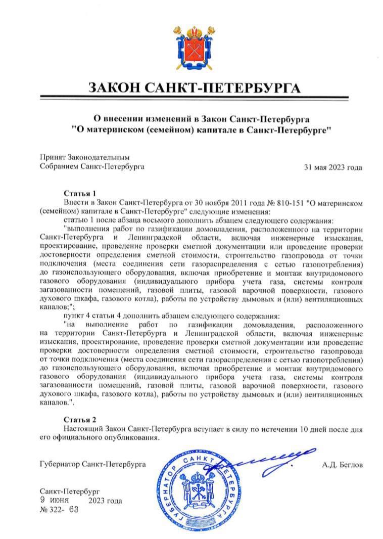 Губернатор Петербурга подписал инициированный депутатами Денисом Четырбоком, Мариной Макаровой и Александром Ржаненковым закон, позволяющий направлять средства регионального материнского (семейного) капитала на газификацию жилья.