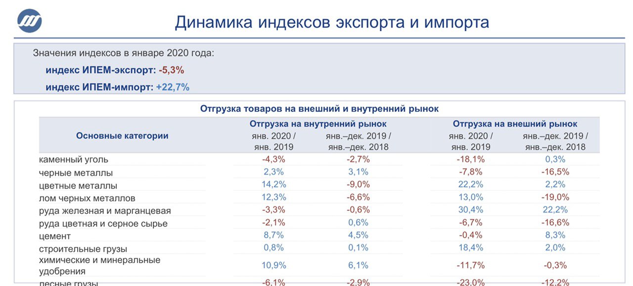 Индекс ИПЕМ- экспорт рухнул в январе на -5,3%. В лидерах падения чёрная металлургия, минеральные удобрения и лесные грузы.
