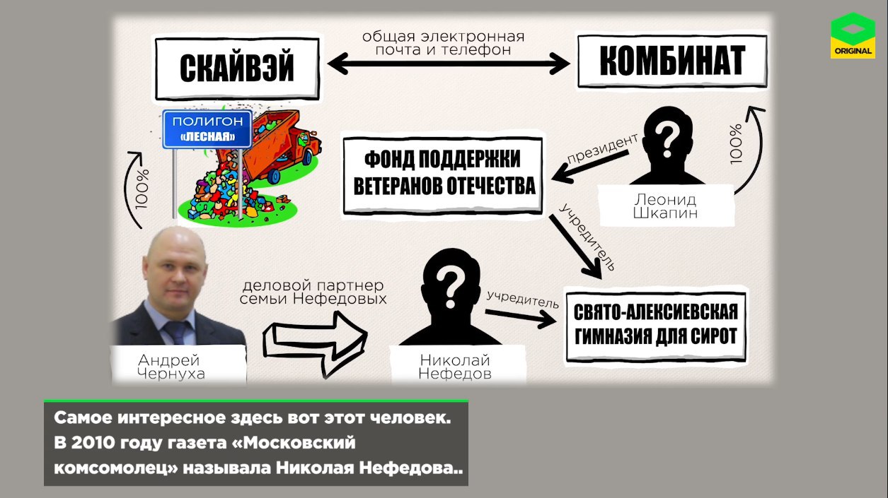Мы не знаем, насколько верны данные источников «Ромба», но помимо связей Нефедова со Шкапиным через Региональный общественный фонд поддержки ветеранов отечества и учрежденную им Православную гимназию святителя Алексия, митрополита московского и всея Руси чудотворца «Ольсово» для детей-сирот и детей, оставшихся без попечения родителей, журналисты также обнаружили связь между «Комбинатом» и компанией «Скайвэй», эксплуатирующей другой скандальный полигон «Лесная» в Серпуховском районе.