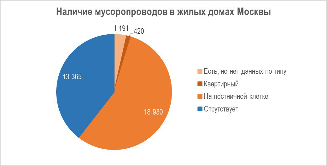 Начали, естественно, с Москвы. Мы проанализировали данные по почти 34 000 жилых домов в столице и выяснили, что мусоропроводы в том или ином виде существуют в 60% из них (см. график). Большинству проживающих в таких домах приходится выходить с ведром на лестничную клетку, а некоторым можно даже и халат не надевать – все удобства прямо в квартире.