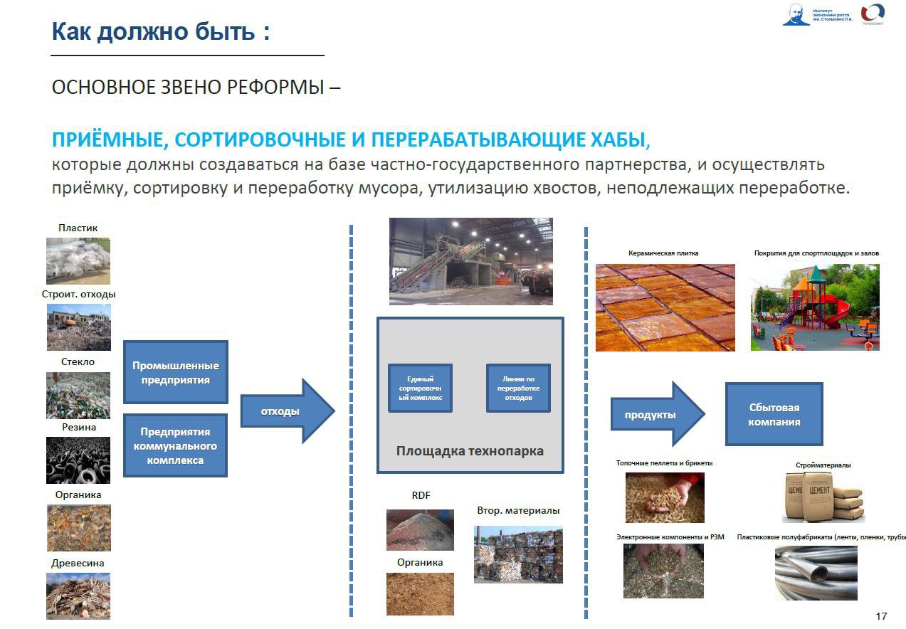С этим сложно не согласиться, проблем, действительно, много. «Плата взимается, а инфраструктура не создана», продолжают Титов и команда и предлагают решить проблему созданием хабов полного цикла (сортировки, переработки и утилизации «хвостов») на базе ГЧП, которые сконцентрируют на себе основные денежные потоки: именно им, по задумке авторов исследования, будут поступать сборы за вывоз мусора, из которых они будут платить операторам за доставку отходов.