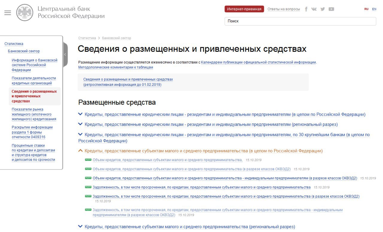 Центробанк расширил линейку публикуемых данных по банковскому кредитованию малого и среднего бизнеса, и теперь можно смотреть эту статистику в разрезе классов ОКВЭД2 (общероссийского классификатора видов экономической деятельности). Посмотреть на новые данные можно здесь (раздел «Кредиты, предоставленные субъектам малого и среднего предпринимательства (в целом по Российской Федерации), развернуть стрелочку слева).