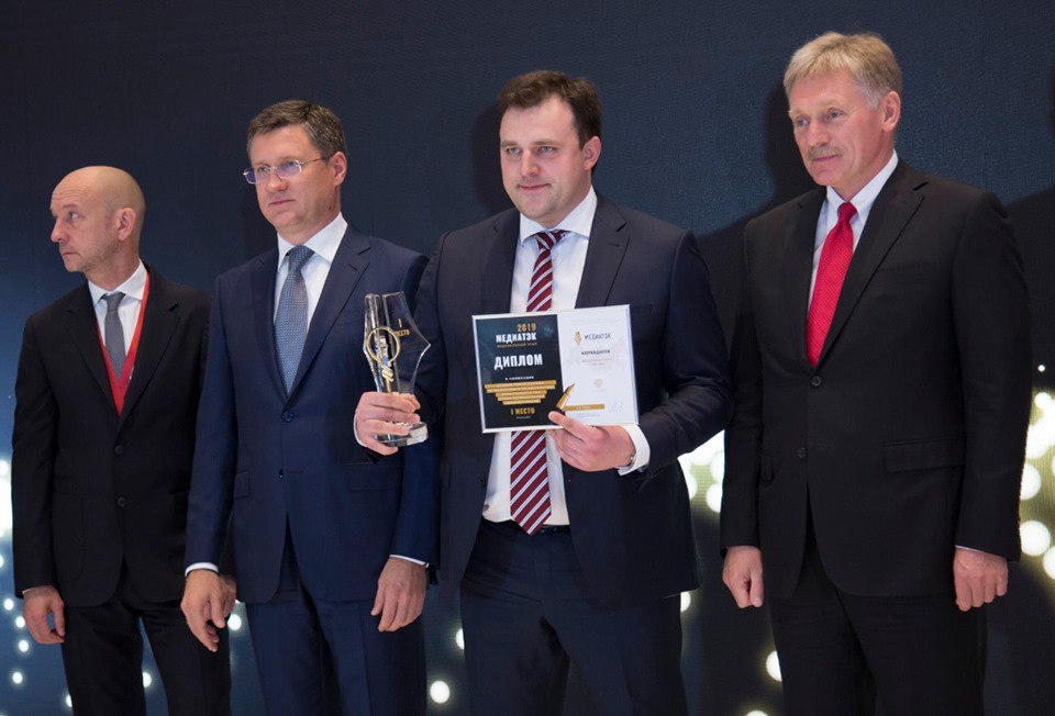 Приз получал сам руководитель помянутого департамента Александр Соловьев. Вот он на снимке – со статуэткой и дипломом в руках. Рядом с самим пресс-секретарем главы государства.