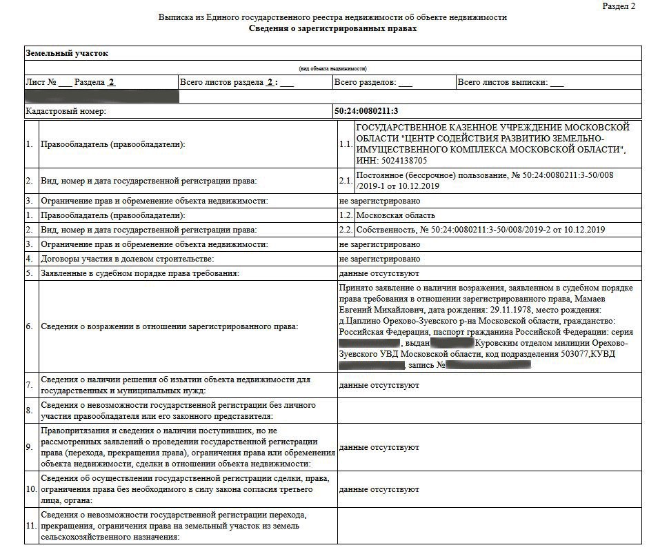 Но… Не спешите торопиться с выводами. В выписке ЕГРН в разделе «Сведения о зарегистрированных правах» помимо собственника земли – Московской области и Центра содействия развитию земельно-имущественного комплекса МО, у которого участок находится в бессрочном пользовании, есть еще один интересный пункт: «Сведения о возражении в отношении зарегистрированного права». В нем указано, что некий Евгений Мамаев, уроженец деревни Цаплино (находится в 8 км от скандального места) заявил в судебном порядке «права требования в отношении зарегистрированного права».