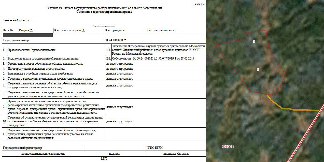На публичной кадастровой карте этот участок также появился в декабре, но, как следует из выписки ЕГРН, еще с мая прошлого года эта земля лесных фондов, предназначенная для заготовки древесины, пищевых лесных ресурсов, лекарственных растений или строительства и эксплуатации водохранилищ, портов и причалов и пр., принадлежит… Химкинскому районному отделу судебных приставов Управления Федеральной службы судебных приставов по Московской области.