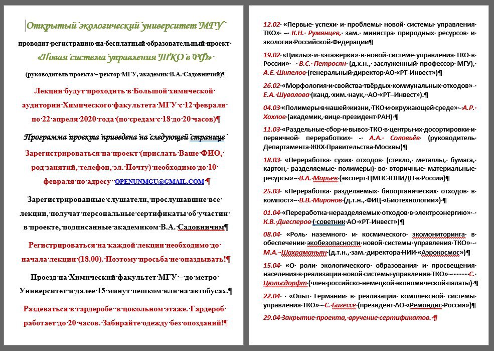 Дошло до нас одно объявление: бесплатный(!) образовательный проект на весьма актуальную тему «Новая система управления ТКО в РФ» от Открытого экологического университета МГУ(!) под руководством самого ректора Виктора Садовничего(!). Лекции будут проходить в большой химической аудитории химического факультета университета (его здание все помнят по финальной сцене культового фильма «Офицеры» с Василием Лановым в главной роли) с 12 февраля по 22 апреля 2020 г., по средам, с 18 до 20 часов.