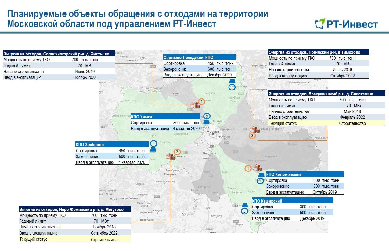 Как следует из презентации одного из менеджеров группы, оказавшейся в нашем распоряжении (см. скрин слайда), помимо уже запущенного КПО «Юг» в Коломенском районе, почти готового к запуску «Севера» в Сергиево-Посадском и неизвестно в каком состоянии находящегося «Дона» – в Каширском к концу 2020 г. компания планирует запустить еще один комплекс – в Химках. Точное место в презентации не указано, пресс-служба «РТ-Инвеста» на наш вопрос не ответила, но мы почти не сомневаемся, что речь идет о полигоне «Левобережный», закрытом в 2012 г., но так и не дождавшемся рекультивации.