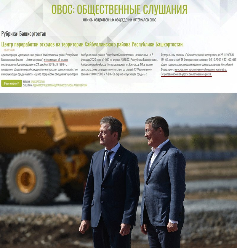 А бывает и так: общественные слушания по проекту строительства центра по переработке отходов в д. Петропавловский Хайбуллинского района Башкирии отменены решением местной администрации на основании коллективного обращения жителей об угрозе экологического риска.