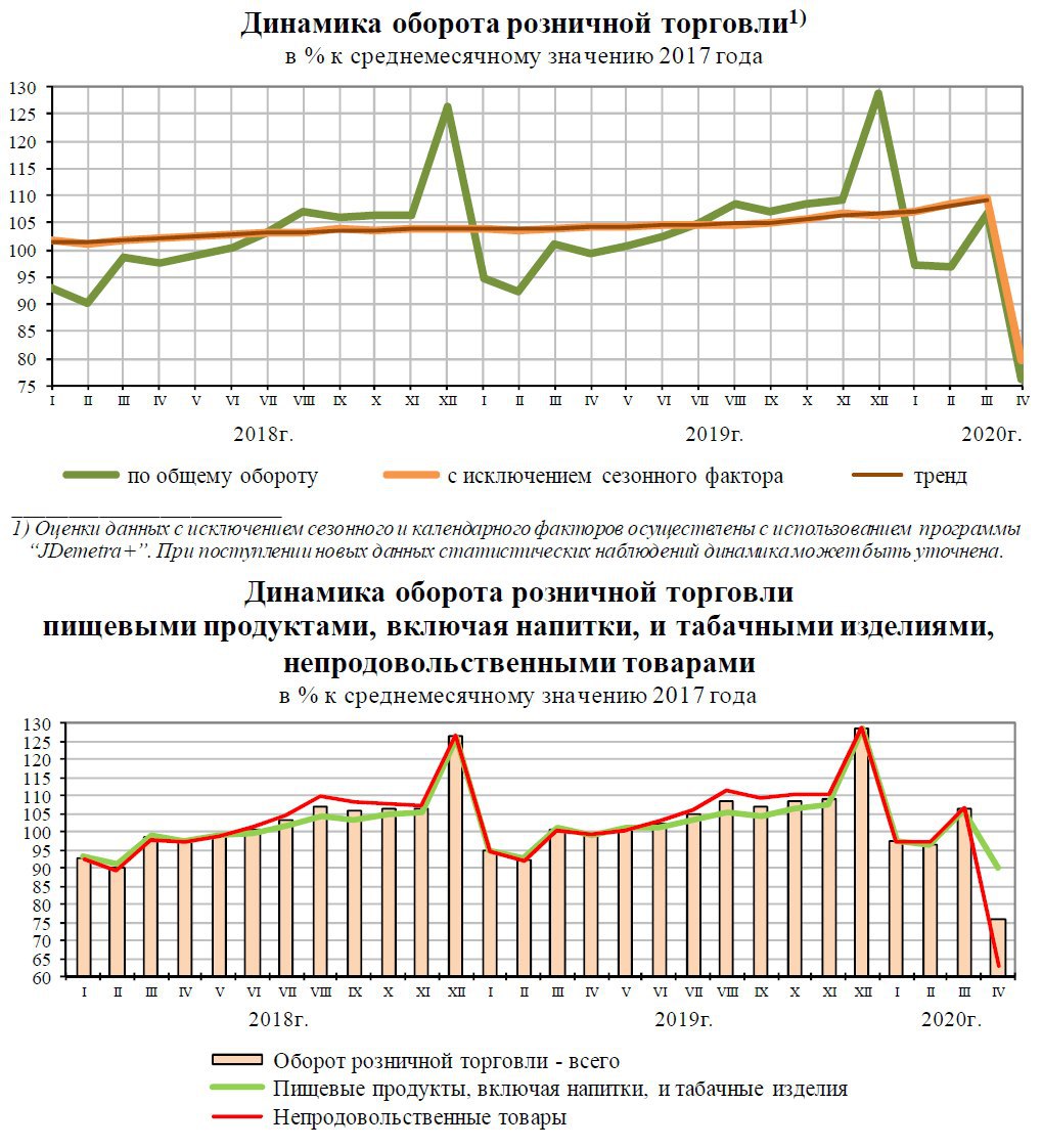 Больше всего просела торговля непродовольственными товарами (одеждой, бытовой техникой, мебелью и пр.) – на 41% к марту и на 37% к апрелю 2019 г. Даже резкий спрос на медикаменты, маски и перчатки не помог. Но и на продуктах, напитках и табаке люди тоже стали экономить(!): минус 15% к марту и 9% к прошлогоднему апрелю.