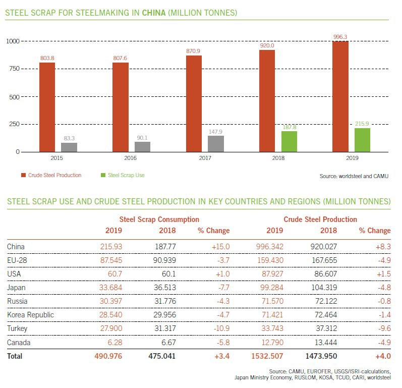 2) Потребление лома при производстве стали в Китае, крупнейшем мировом производителе, выросло в 2019 г. на 15% до 216 млн т. При этом доля лома в общем объеме производства увеличилась с 20,4% до 21,7%.