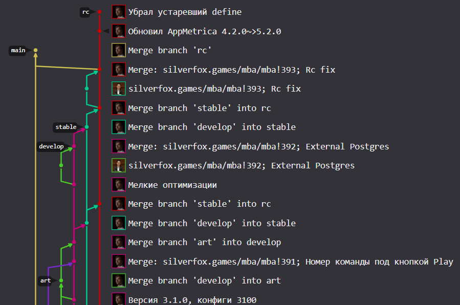 - Состояние из этой ветки всегда соответствует состоянию приложения у пользователей на девайсах.
