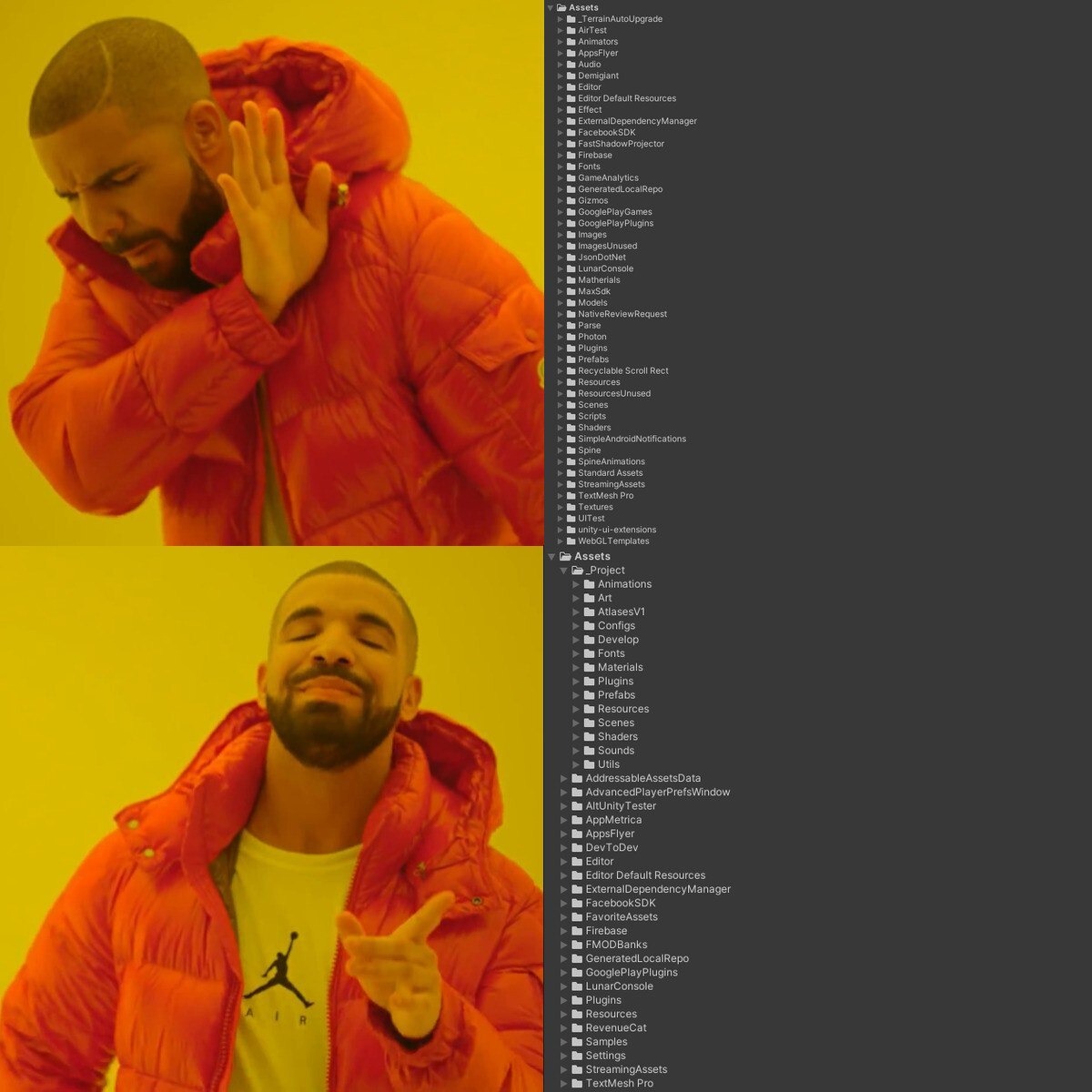 Поскольку нет единого гайдлайна для именования и структуры папок, то со временем, папка Assets тоже превращается в помойку. И любой импортированный в проект пакет ассетов может наследить в иерархии так, как ему вздумается. Создавая сколько угодно своих папок в корне.