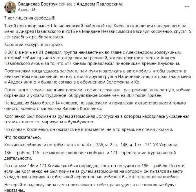 «В 2016 в ночь на 21 февраля, группа неизвестных во главе с Александром Золотухиным, который сейчас прячется от следствия за границей, хотели похитрить меня и Андрея Павловского за то, что «17 канал», где мы тогда работали, якобы принадлежал чиновникам времен Януковича.