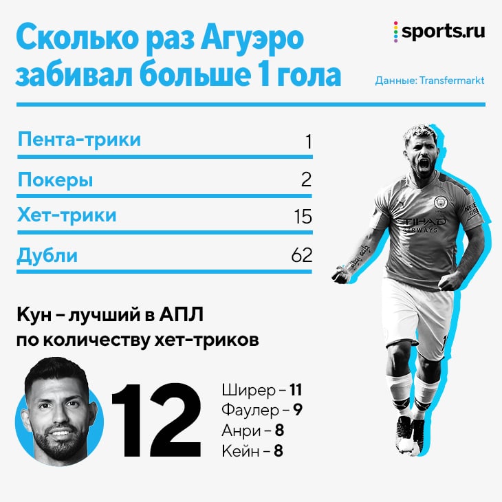 • Агуэро – лучший в АПЛ по хет-трикам и по соотношению минут на гол, а еще рекордсмен АПЛ по голам за один клуб (184).