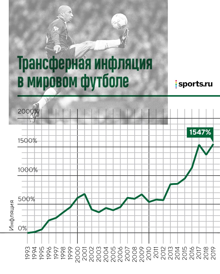 Ниже – график футбольной инфляции с 1993-го по 2019-й. 1500% за 25 с лишним лет – вау!