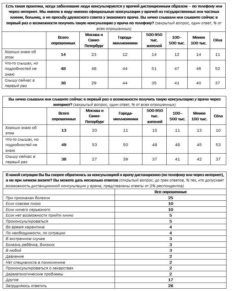 Более половины россиян информированы о телемедицине — возможности получить консультацию врача по телефону или по интернету (по 62% соответственно). В столицах информированность выше: о возможности проконсультироваться с врачом по телефону знают 71%, по интернету — 73%. Получали подобную консультацию дистанционным способом 8% информированных россиян: 6% посредством телефона, 2% — через интернет.