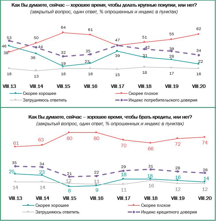 Для приобретения дорогостоящих вещей большинство россиян откладывают деньги (62%, +4 п.п. с 2010 г.). Пользуются услугой кредитования 27%, что на 4 п.п. больше, чем 10 лет назад