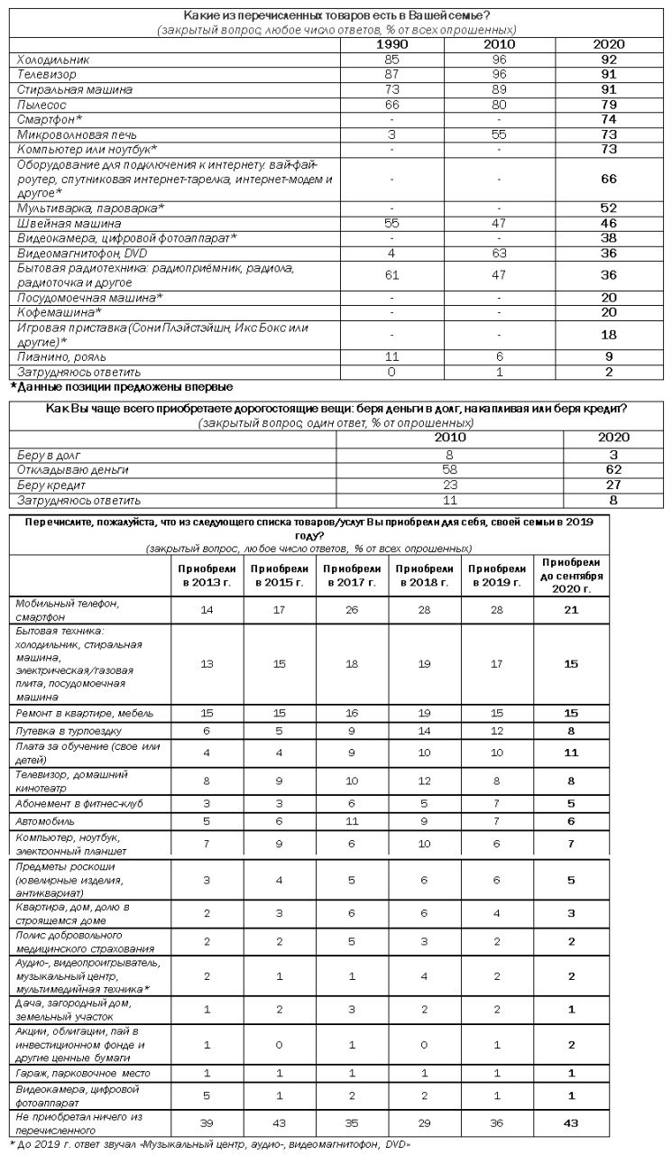 В 2019 году самым популярным приобретением для себя или своей семьи стал мобильный телефон — его приобрел каждый третий россиянин (28%), как и в 2018 году. За шесть лет популярность данной категории товаров выросла в два раза. До пандемии коронавируса, по данным на 24 января, каждый четвертый россиянин планировал в 2020 году сделать ремонт в квартире или приобрести мебель (25%). Каждый пятый россиянин, как и в прошлом году, планировал приобрести путевку в поездку и потратиться на путешествие (21%).