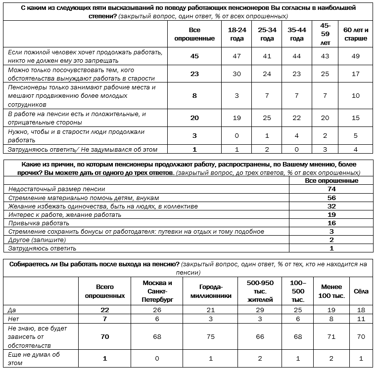 Среди тех, кто не находится на пенсии, собираются работать после выхода на нее 22%, чаще жители городов с населением 500-950 тыс. жителей (29%) и столиц (26%). Не планируют выходить на работу 7%, чаще жители сёл (11%). Не знают точно — ведь это будет зависит от обстоятельств — 70% россиян.