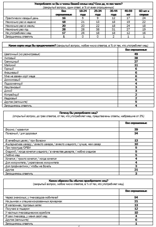 Большинство россиян (82%) употребляют мед, при этом 16% едят его ежедневно, 18% — несколько раз в неделю, 20% — несколько раз в месяц, а 28% — несколько раз в год.