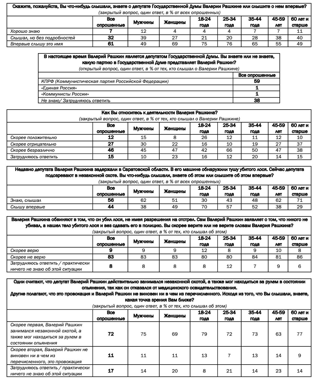 Среди тех, кто слышал историю, 72% полагают, что Валерий Рашкин действительно занимался незаконной охотой, а также мог находиться за рулем в состоянии опьянения, 11% убеждены, что Валерий Рашкин не виновен ни в чем из перечисленного, это провокация.