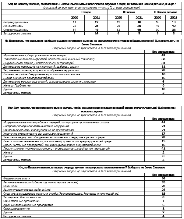 По мнению 40% россиян, за последние два-три года экологическая ситуация в их регионе не изменилась, а 38% полагают, что скорее ухудшилась. В то же время 45% наших сограждан считают, что экологическая ситуация в России за это время ухудшилась.