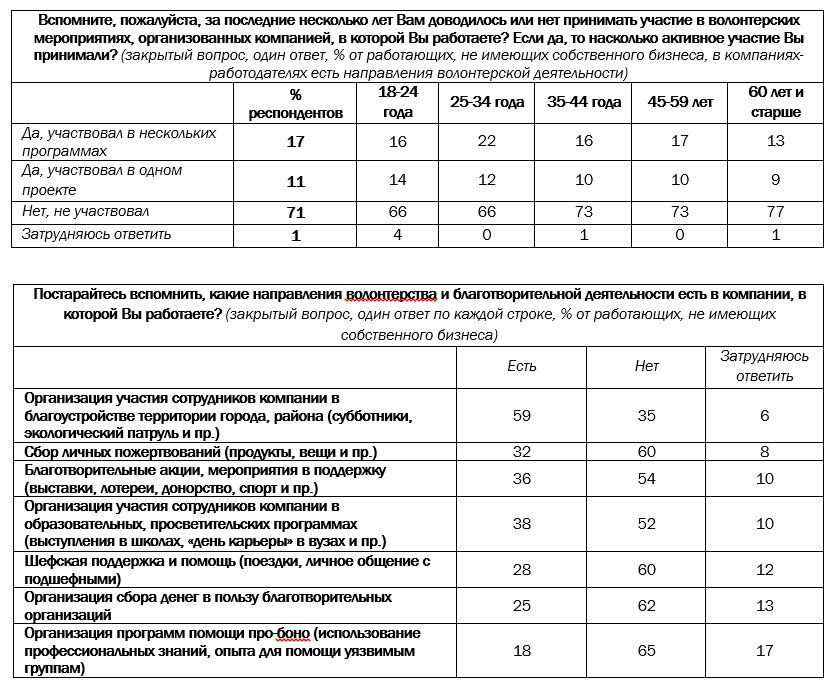 В волонтерских мероприятиях, реализующихся компанией, участвовали более четверти (28%) сотрудников (в т.ч. 17% - неоднократно, 11% - разово). Потенциально корпоративное волонтерство может привлечь 68% работников (20% заявляют о безоговорочной готовности). При организации корпоративного волонтерства в месте работы, россияне готовы в первую очередь оказать поддержку в сборе вещей и обеспечение продуктами питания (38%). Еще 31% опрошенных выразили готовность к помощи по благоустройству территории, донорству и прочих мероприятий, не направленных на поддержку конкретных групп людей.