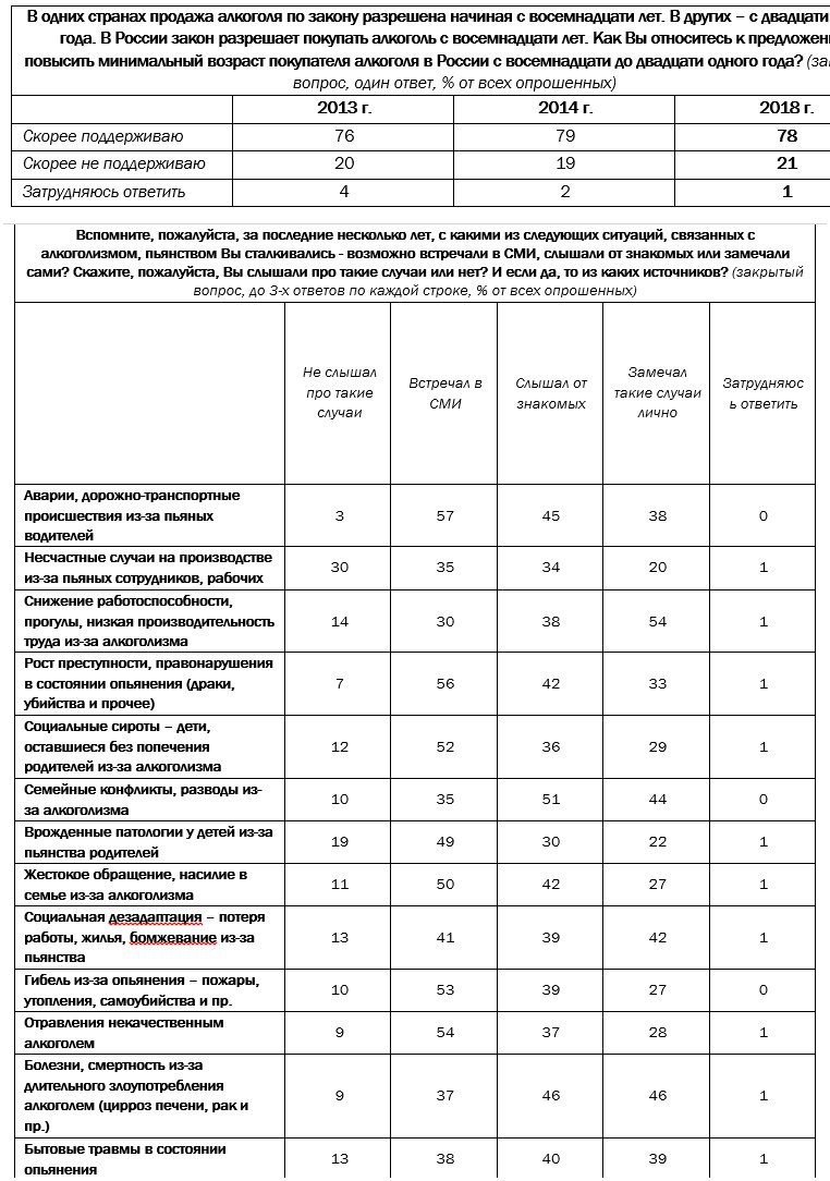 В поддержку увеличения возраста для продажи алкоголя с 18 до 21 года выступают 78% россиян. Каждый второй респондент (54%) лично замечал случаи снижения работоспособности и низкую производительность труда из-за алкоголизма. Более четверти (29%) россиян знают детей, оставшихся без попечения родителей из-за их алкоголизма, а 27% респондентов лично замечали жестокое обращение и насилие в семье из-за чрезмерного употребления алкоголя. Аварии и дорожно-транспортные происшествия из-за пьяных водителей видели 38% опрошенных, но чаще встречали новости об этом в СМИ (57%).