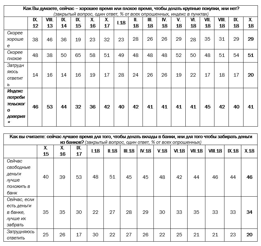 С начала 2018 г. индексы потребительского и кредитного доверия стабильны. Согласно данным последнего опроса, уже более четверти граждан (29%) оценивают нынешнее время как благоприятное для крупных покупок. Половина (51%), однако, пока настроена скептически. Доверие к банкам в последние месяцы незначительно снизилось: так, с января по октябрь 2018 г. доля респондентов, считающих вариант вклада на счет лучшим вариантом распоряжения свободными средствами, составляет 42-51%, непосредственно в октябре – 46%.