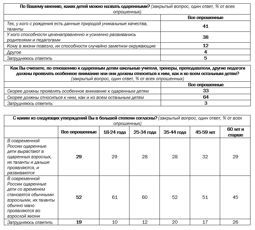 На сегодняшний день в российском обществе не сложилось единого мнения о том, каких детей можно назвать одаренными: 41% опрошенных утверждают, что это те дети, у кого с рождения есть данные природой уникальные качества и таланты, а 38% придерживаются мнения, что это дети, чьи способности целенаправленно и усиленно развивались родителями и педагогами. В общении со сверстниками у одаренных детей возникает больше трудностей, считают 41% россиян, хотя 45% опрошенных утверждают, что трудностей примерно столько же. По мнению 52% респондентов, в современной России одаренные дети со временем становятся обычными взрослыми, их таланты мало проявляются во взрослой жизни.