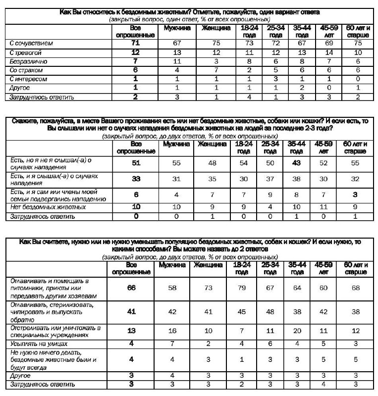 Подавляющее большинство россиян испытывает сочувствие к бездомным животным и высказывается за то, чтобы разными способами помогать им. Приверженцы стратегии «ловить и убивать» — в абсолютном меньшинстве.