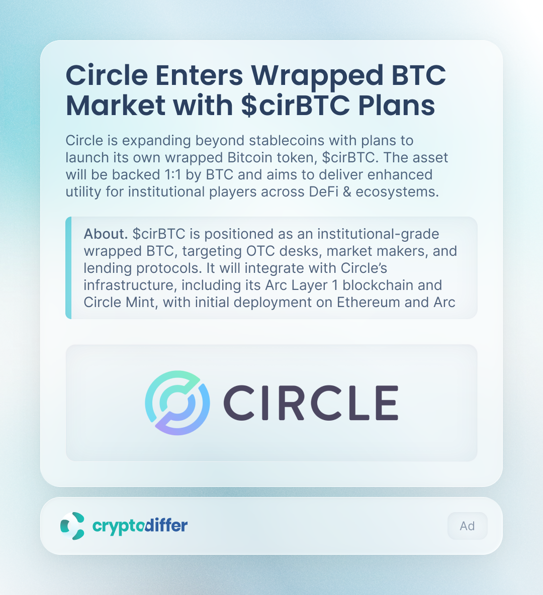 cirBTC is positioned as an “institutional-grade” wrapped BTC, targeting OTC desks, market makers, and lending protocols. It will integrate with Circle’s infrastructure, including its Arc Layer 1 blockchain and Circle Mint, with initial deployment on Ethereum and Arc.