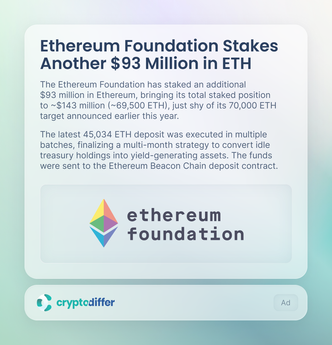 The Ethereum Foundation has staked an additional $93M in Ethereum, bringing its total staked position to ~$143M (~69,500 ETH), just shy of its 70,000 ETH target announced earlier this year.